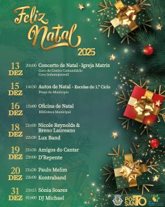 O município do Porto Santo convida toda a população a participar nas festividades de Natal e Fim de Ano! A programação terá início no dia 13 de dezembro com o Concerto de Natal organizado pela Junta de Freguesia do Porto Santo, seguindo-se os Autos de Natal e a Oficina de Natal.
